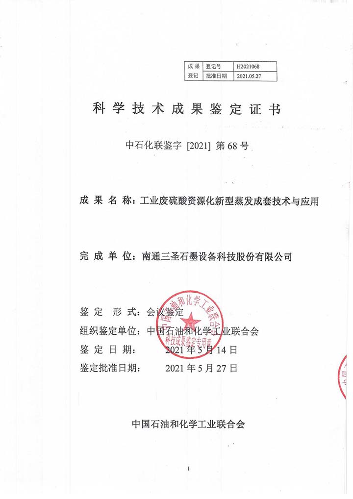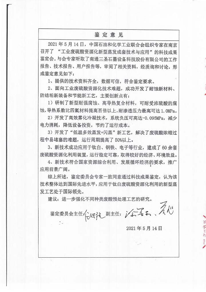 2021年5月27日,中國(guó)石油和化學(xué)工業(yè)聯(lián)合會(huì)批準(zhǔn)了南通三圣石墨設(shè)備科技股份有限公司“工業(yè)廢硫酸資源化新型蒸發(fā)成套技術(shù)與應(yīng)用”的科技成果鑒定,由南京大學(xué)任洪強(qiáng)院士擔(dān)任主任,華東理工大學(xué)涂善東院士、南京工業(yè)大學(xué)喬旭校長(zhǎng)擔(dān)任副主任的鑒定委員會(huì)專家一致認(rèn)為,該技術(shù)整體達(dá)到國(guó)際先進(jìn)水平,應(yīng)用于鈦白廢硫酸資源化利用的新型蒸發(fā)工藝處于國(guó)際領(lǐng)先。