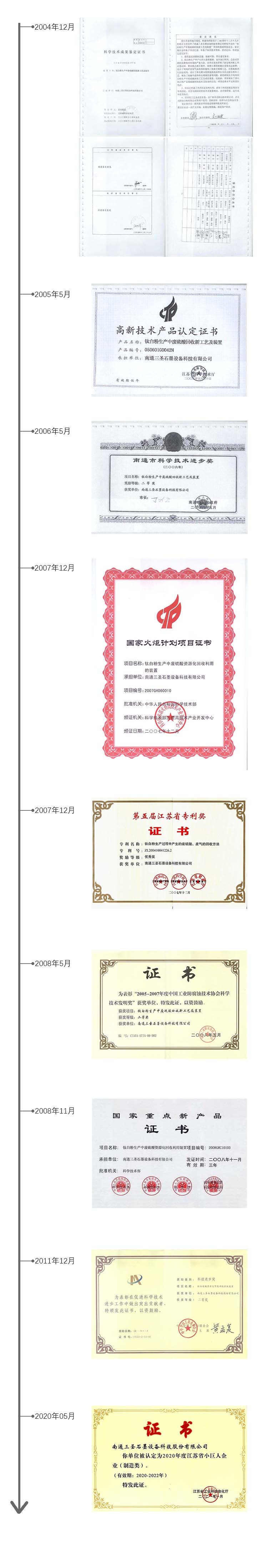南通三圣該項(xiàng)技術(shù)先后得到了政府諸多部門的高度評(píng)價(jià)。2004年12月,“鈦白粉生產(chǎn)中廢硫酸回收新工藝及裝置”通過(guò)江蘇省科技廳組織的科技成果鑒定,鑒定意見(jiàn)指出,該項(xiàng)成果填補(bǔ)了國(guó)內(nèi)鈦白粉產(chǎn)業(yè)廢硫酸回收技術(shù)及裝備的空白,總體水平達(dá)到國(guó)際先進(jìn)。2005年5月,該項(xiàng)成果被認(rèn)定為江蘇省高新技術(shù)產(chǎn)品。2006年5月,該項(xiàng)成果榮獲南通市科技進(jìn)步二等獎(jiǎng)。2007年12月,“鈦白粉生產(chǎn)中廢硫酸資源化回收利用的裝置”被科技部列為國(guó)家火炬計(jì)劃項(xiàng)目。2007年12月,“鈦白粉生產(chǎn)過(guò)程中產(chǎn)生的廢硫酸、廢氣的回收方法”榮獲江蘇省優(yōu)秀專利獎(jiǎng)。2008年5月,“鈦白粉生產(chǎn)中廢硫酸回收新工藝及裝置”榮獲中國(guó)工業(yè)防腐蝕技術(shù)協(xié)會(huì)技術(shù)發(fā)明二等獎(jiǎng)。2008年11月,“鈦白粉生產(chǎn)中廢硫酸資源化回收利用裝置”被科技部、環(huán)保部、商務(wù)部、國(guó)家質(zhì)檢總局認(rèn)定為國(guó)家重點(diǎn)新產(chǎn)品。2011年12月,“鈦白廢酸資源化節(jié)能回收系統(tǒng)裝置”榮獲中華全國(guó)工商業(yè)聯(lián)合會(huì)科技進(jìn)步二等獎(jiǎng)。2020年,公司以工業(yè)廢副硫酸低能耗蒸發(fā)濃縮與資源化回收成套裝備產(chǎn)品獲得江蘇省專精特新小巨人企業(yè)榮譽(yù)稱號(hào)。